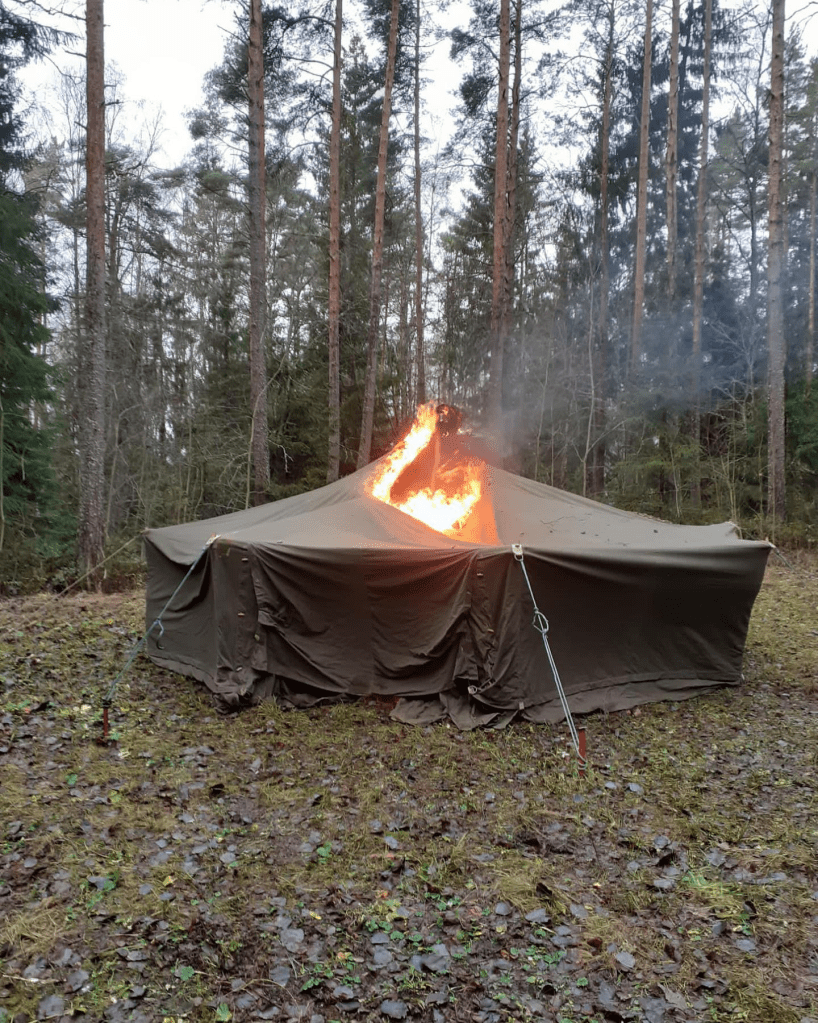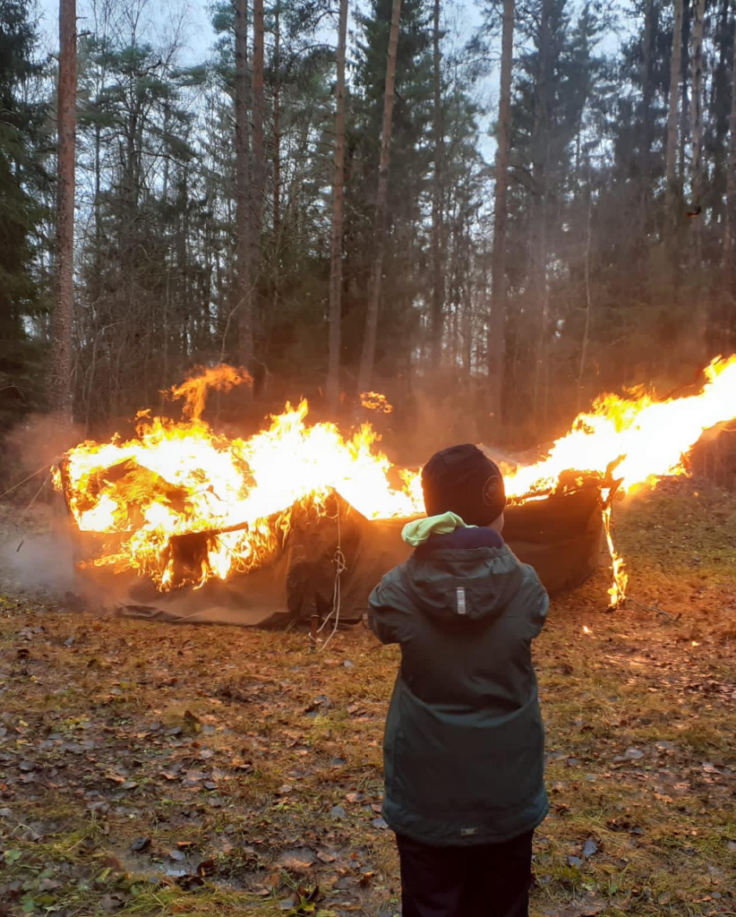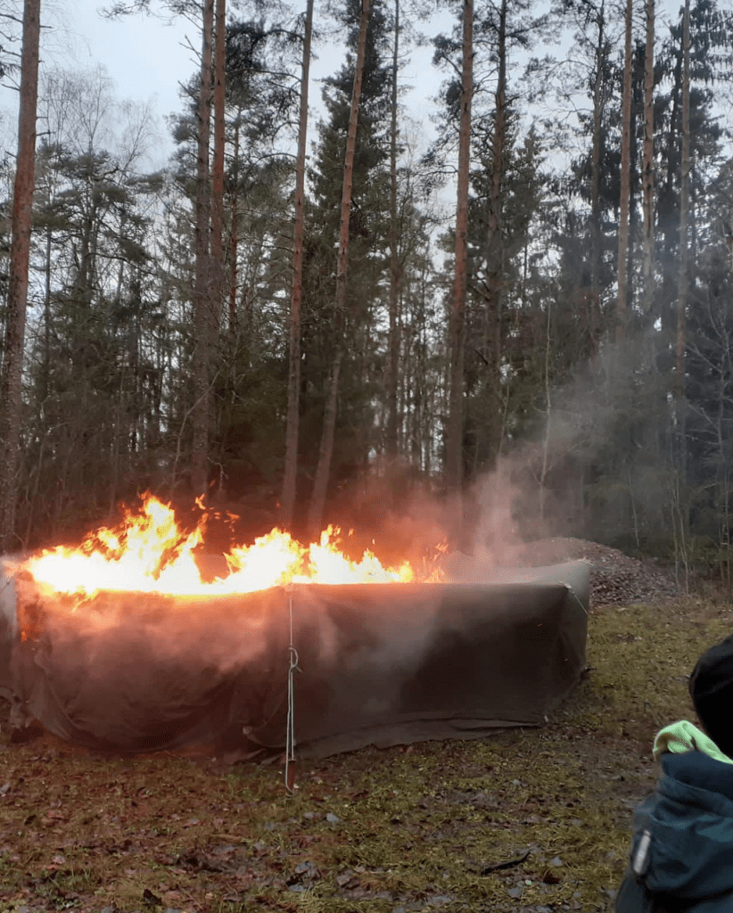 Talviteltta palaa! Sahalahden VPK:n kanssa vietettiin mahtava tulipäivä. Opimme miten tuli käyttäytyy ja miten alkusammutus tehdään. Poltimme vanhan talviteltan, oli tosi mielenkiintoista! Palokaasujen kuumuus ilman suoraa liekin kosketusta kankaaseen sytytti teltan 9 minuutin kohdalla (teltan sisälle sytytettiin nuotio).