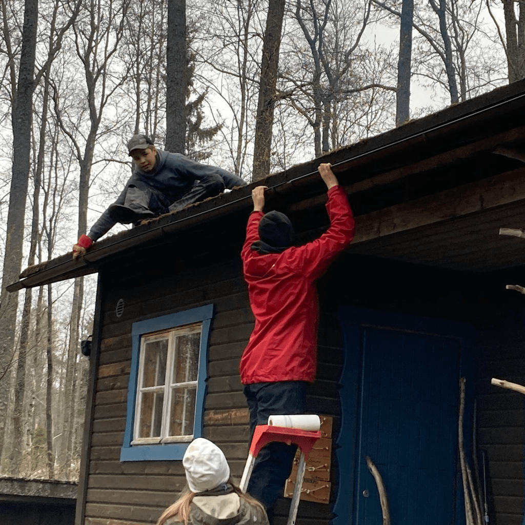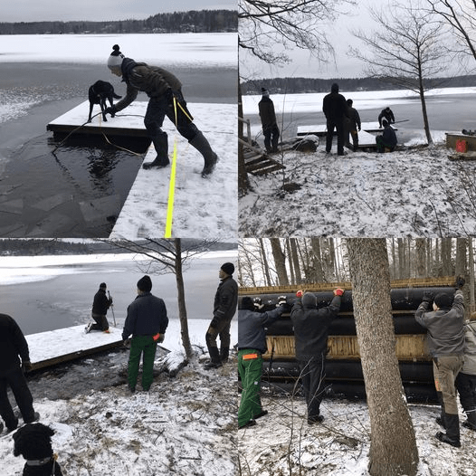 Piti laittaa laituri takaisin vesille uimarannan kunnostuksen jälkeen. Se onnistuikin mutta samalla siivottiin pihaa, korjattiin ränniä, poltettiin roskapuuta ja kasattiin polttopuita. Lopuksi nautittiin vielä Sahalahden Krouvin mainiot kanakorit.