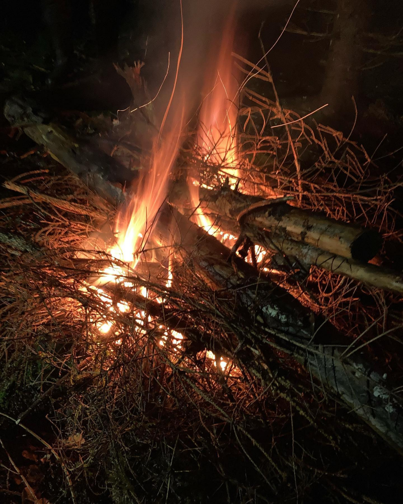 Me eksyttiin märkään metsään mutta onneksi oli puukko ja tulitikut mukana.