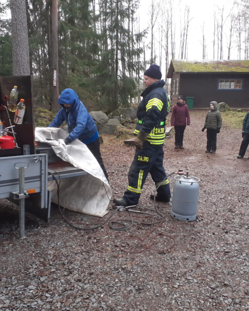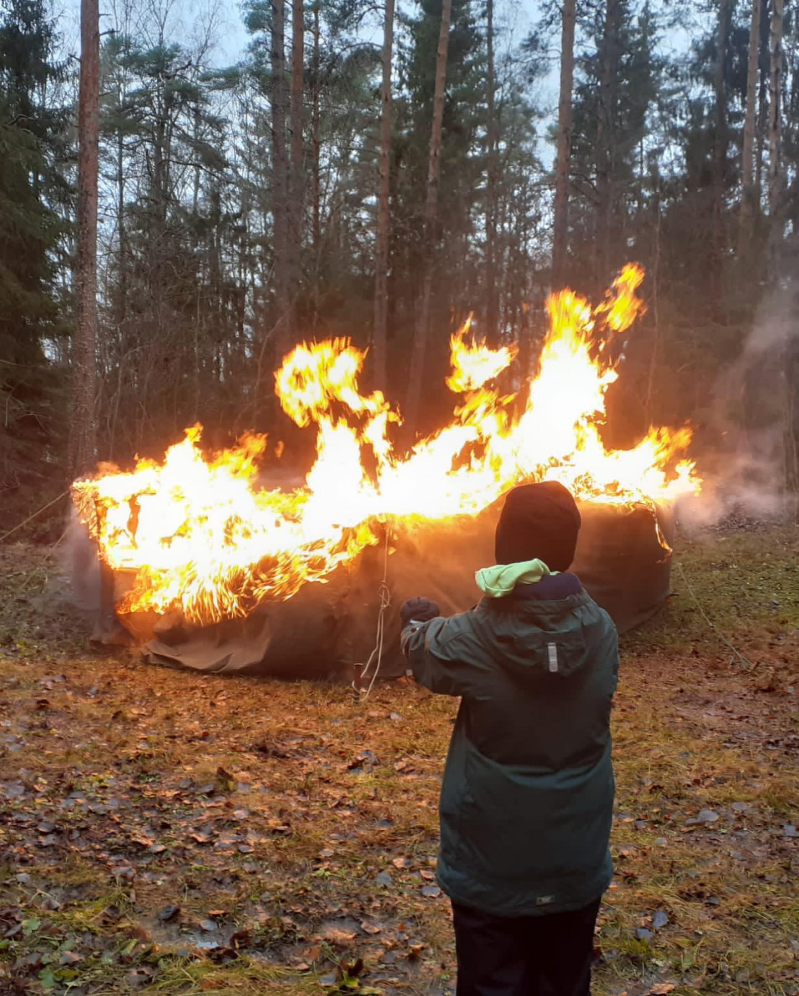 Talviteltta palaa! Sahalahden VPK:n kanssa vietettiin mahtava tulipäivä. Opimme miten tuli käyttäytyy ja miten alkusammutus tehdään. Poltimme vanhan talviteltan, oli tosi mielenkiintoista! Palokaasujen kuumuus ilman suoraa liekin kosketusta kankaaseen sytytti teltan 9 minuutin kohdalla (teltan sisälle sytytettiin nuotio).